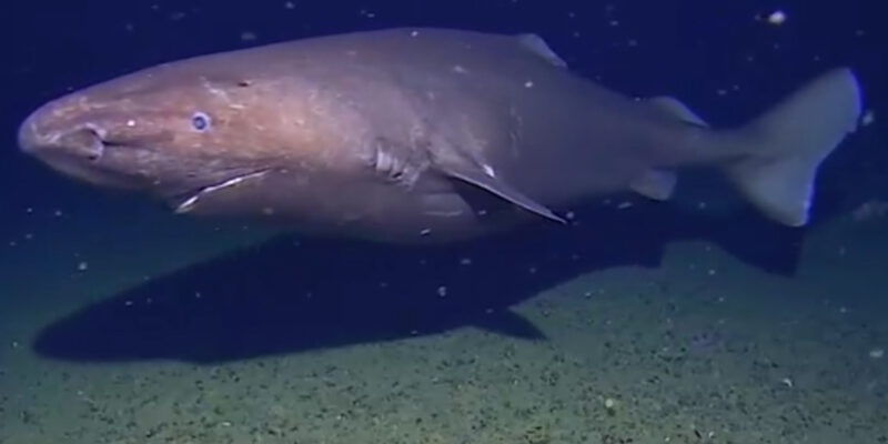 En el material se aprecia un tiburón nadando lentamente, que los especialistas asignan a la familia de tiburones dormilones (Somniosidae). No es posible determinar con seguridad qué especie es solo a partir de las imágenes — los tiburones dormilones se parecen mucho entre sí. No obstante, un experto independiente considera posible que se trate del tiburón dormilón antártico (Somniosus antarcticus) — una especie que se considera «el tiburón que habita más al sur».